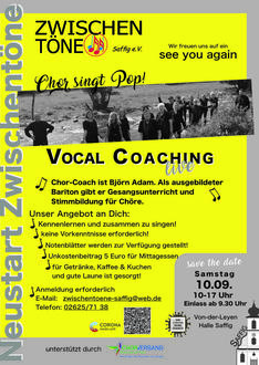 Nach der langen Zeit der Corona-Einschränkungen wird es wichtig, für die Chöre und die Aktiven wieder einen Chor-Workshop anbieten zu können. Im Sinne des Neustarts der Saffiger Zwischentöne liegt der Schwerpunkt wieder auf Popmusik im Chor. Der Gesangverein Zwischentöne Saffig e.V. lädt am 10. September 2022 zum Chorcoaching nach Saffig von 10-17 Uhr in die ‚Von-der-Leyen-Halle‘ ein.