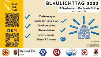 Es ist es wieder soweit! Der Blaulichttag in Saffig findet statt. Hier werden sich die Freiwilligen Feuerwehren inkl. der Jugendfeuerwehr, die Polizei, das THW, die Rettungshunde, die Bergwacht, die DLRG und das DRK präsentieren.
