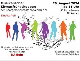 Keine Kirmes ohne Frühschoppen! Seit Jahrzehnten pflegt die Nickenicher Chorgemeinschaft diese schöne Tradition und richtet den Kirmesfrühschoppen an Kirmesmontag aus. Die Nickenicher Bevölkerung nimmt dieses Angebot immer wieder gerne an, und so ist der Kirmesmontag seit Jahren bei Vielen als fester Termin gesetzt.