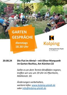 Die Kolpingsfamilie Plaidt läd zum 4. Gartengespräch in den Garten der Familie Rochlus, am Kürchen 22 um 18.30 Uhr ein.
