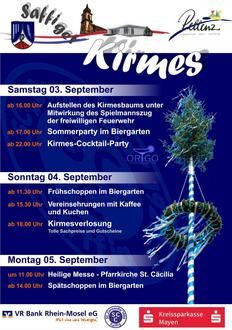 Der Samstag, 03. September startet um 16:00 Uhr mit dem Aufstellen des Kirmesbaumes. Dabei werden die Fußballer des SCC vom Spielmannszug der Freiwilligen Feuerwehr Saffig musikalisch unterstützt. Neben dem Kirmesbaumklettern der Kinder steht auch wieder der Fassanstich durch Ortsbürgermeister Dirk Rohm auf dem Programm.