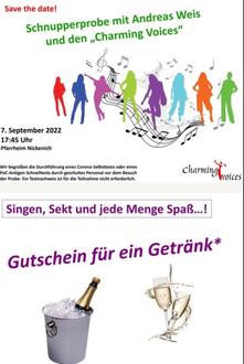 Überzeugt? Dann komm‘ auch du (wenn du eine Frau bist) zur großen Schnupperprobe der „Charming Voices“ am 07. September. Eine vorherige Testung auf Corona wird empfohlen, ist jedoch keine Bedingung für die Teilnahme.