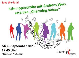 NICKENICH. Der Nickenicher Frauenchor „Charming Voices“ lädt wieder zur Schnupperprobe ein. Nach dem großen Erfolg des Konzertes anlässlich ihres 20-jährigen Bestehens im Mai diesen Jahres stellen sich die Sängerinnen nun neuen Aufgaben und Herausforderungen. Ein idealer Zeitpunkt für alle interessierten Damen zwischen 16 bis XX Jahren, sich den Chor einmal genauer anzuschauen und eventuell als aktive Sängerin einzusteigen. Die Schnupperprobe findet am Mittwoch, 06. September um 17:45 Uhr im Pfarrheim (neben der Kirche) in Nickenich statt und steht unter dem Motto „Singen, Sekt und jede Menge Spaß!“. An diesem Abend haben alle sangesfreudigen Damen aus Nickenich und Umgebung die Möglichkeit, die „Charming Voices“, ihren Chorleiter Andreas Weis, das Repertoire und den Ablauf einer Probe kennenzulernen - natürlich absolut unverbindlich und kostenlos. Ein gratis Glas Sekt oder ein anderes Getränk gibt es dazu. Angesprochen fühlen sollten sich alle Frauen, die schon länger mit dem Gedanken spielen, es einmal mit dem Singen zu versuchen, sich aber nicht so recht trauen…. alle Frauen, die bereits in einem Chor gesungen haben und gerne wieder einsteigen würden …. alle Frauen, die ein glücklich machendes Hobby in netter Gemeinschaft suchen…. alle Frauen, die einfach nur Spaß an Musik und am Singen haben. Ob chorerfahren oder Neuling, ob jung oder alt, ob Sopran oder Mezzo, jede neue Stimme ist herzlich eingeladen, sich gemeinsam mit den „Charming Voices“ auf musikalische Wege zu begeben..