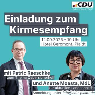 Die Sommerferien sind zu Ende und die Plaidter Kirmes nähert sich mit großen Schritten. Dies möchte der CDU Ortsverband Plaidt nutzen und lädt alle Interessierten am Freitag den 12.09.2025 zu einem Kirmesempfang im Hotel Geromont in Plaidt ab 19 Uhr ein. Neben der Landtagsabgeordneten Anette Moesta wird Herr Patric Raeschke von der Prosec GmbH aus Mendig zum Thema Cybersicherheit referieren. In Zeiten der zunehmenden Vernetzung und Digitalisierung ist es nicht nur für den Staat und Unternehmen, sondern für jeden Bürger unerlässlich sich mit dem Thema des Schutzes der eigenen Daten und dementsprechend der vielen verschiedenen Angriffsformen auseinanderzusetzen. Dies wird Herr Raschke den Zuhörern in seinem Vortrag näherbringen.