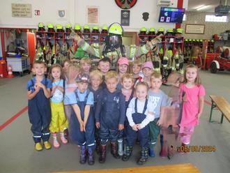 Nachdem sich alle bei einem gemeinsamen Frühstück gestärkt und auf der Wiese ausgetobt hatten, demonstrierte uns die Feuerwehr, was alles zu einer Feuerwehrausrüstung gehört und zeigte uns die Rettung eines Kindes im Brandfall. Auch der große Lüfter zur Rauchbekämpfung wurde gezeigt.