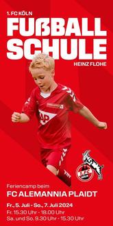 Nach einjähriger Pause ist es dem FC Alemannia Plaidt wieder gelungen, die Fußballschule des 1. FC Köln für ein Fußballcamp zu gewinnen. Vom 05. bis 07. Juli 2024 findet das Camp für alle fußballbegeisterten Mädchen und Jungen im Alter von 6 bis 15 Jahren am Pommerhof in Plaidt statt.