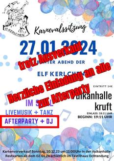 Auch wenn unsere Karnevalssitzung am kommenden Samstag, den 27.01.2024 ausverkauft ist, sind auf unserer anschließenden Afterparty auch Gäste ohne Sitzungskarte herzlich willkommen. Das voraussichtliche Ende der Sitzung und somit der Start der Afterparty wird gegen 00:15 Uhr/ 00:30 Uhr erwartet. Wir freuen uns auf euch und einen erfolgreichen Sitzungsabend.