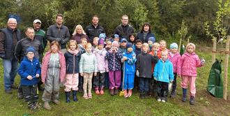 Angeleitet durch die Mitarbeiter der Firma „Gartenpflege Müller“ in Mendig und mit Hilfe einiger Eltern, Großeltern und ihrer Lehrerin konnten die Kinder selbst Pflanzlöcher buddeln, setzten die Bäume ein und halfen eifrig beim Befestigen sowie Ausstatten mit Bewässerungssäcken.