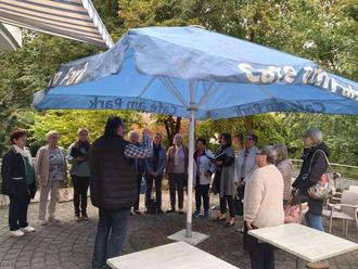 Der riesige Sonnenschirm wurde kurzerhand zum Regenschutz umfunktioniert, so dass das Singen stattfinden konnte.