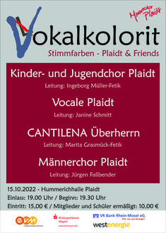 Der MC Plaidt möchte seinem Titel „VOKALKOLORIT – Plaidter Stimmfarben & Friends“ gerecht werden. Samstag, 15. Oktober kann ein sehr interessanter Abend werden, allerdings nur für die, die ab 19.00 Uhr den Weg in die Hummerichhalle finden. Um 19.30 Uhr beginnt die Veranstaltung. Eintrittskarten sind auch an der Abendkasse erhältlich.