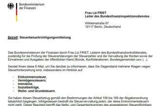 Das als PDF-Datei angefügte Schreiben enthält das Logo des Bundesfinanzministeriums und wird im Namen eines fiktiven „Bundesfinanzinspektionsdienst“ versendet.