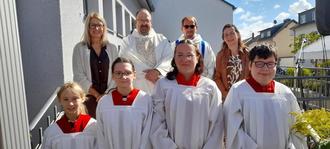 Mit am Altar waren (untere Reihe v.l.) Lina Copeland, Malina Meid, Cassie Leitz und Nicholas Leitz sowie in der oberen Reihe Evi Weinand, Pfarrer René Unkelbach, Diakon Andreas Schlösser und Susanne Schimanski.