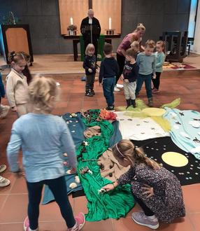 Plaidt. Die Kinder und Erzieherinnen machten sich am Vormittag des 2. Oktobers auf den Weg in die evangelische Christuskirche um gemeinsam mit Herrn Pfarrer Stephan Koch Erntedank zu feiern. Auch einige Eltern nahmen am Gottesdienst teil. Passend zum Thema: „Gott erschafft die Welt“ entstand nach und nach ein Bodenbild. Mit farblichen Tüchern wurden Tag und Nacht, Himmel und Erde und das Wasser dargestellt. Dazu kamen dann Tiere der Luft, des Wassers und der Erde und letztendlich die Menschen. Allerlei Naturmaterialien vervollständigten das Bild. Nach dieser Geschichte gaben die Kinder ihre von zu Hause mitgebrachten Obst- und Gemüsesorten ab und waren erstaunt wieviel verschiedene Gaben am Ende auf dem Altar zusammenkamen. Lieder, Gebete und Fürbitten machten den Gottesdienst festlich. Danach gingen Alle dankbar und zufrieden in die Kita zurück.
