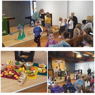 Sie bauten Häuser, Scheunen für die Tiere und bewirtschafteten die Äcker. Als die Zeit der Ernte kam, dankte Noah und seine Familie Gott für all die vielen Gaben. Begleitet vom Gesang „Seht, was wir geerntet haben“, überreichten alle Kinder im Anschluss ihre von zu Hause mitgebrachten Obst- und Gemüsesorten und waren erstaunt, wie viel verschiedene Gaben am Ende am Altar zusammenkamen. Lieder, Gebete und Fürbitten machten den Gottesdienst festlich. Das Team der Kita Arche Noah bedankt sich recht herzlich für die vielen Obst- und Gemüsespenden und hofft, dass alle ein schönes Erntedankfest hatten.