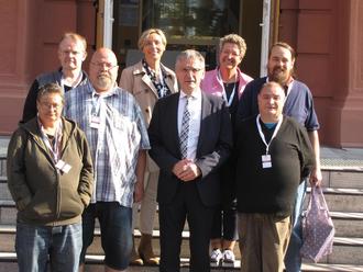 Auf Einladung des Landtagspräsidenten Hendrik Hering, war eine Gruppe der Barmherzigen Brüder Saffig zu Besuch im Mainzer Landtag. Vier Beschäftigte der St. Josefs-Werkstätten Plaidt, ein Klient der Gemeindepsychiatrischen Dienste Andernach und zwei Begleitpersonen machten sich auf den Weg in die Landeshauptstadt. Dort angekommen, wurde die Gruppe vom Landtagspräsidenten vor dem Deutschhaus herzlich begrüßt. Im anschließenden Austausch ging es unter anderem um bessere Beschäftigtenlöhne in den Werkstätten für beeinträchtigte Menschen und deren wichtige Rolle bei der der Teilhabe von Menschen am Arbeitsleben. Nach einem ausführlichen und konstruktiven Gespräch folgte ein gemeinsames Mittagessen im Landtagsrestaurant. Im Anschluss hat eine studentische Honorarkraft über die Geschichte und politische Bedeutung des Landtages von Rheinland-Pfalz informiert. Es erfolgte auch eine kurze Einführung in die Parlamentsarbeit und den Ablauf einer Plenarsitzung. Einer solchen wohnte man danach etwa eine Stunde lang bei. Nach einem gemütlichen Stadtbummel durch die Mainzer Altstadt, machte man sich schließlich wieder auf die Heimreise nach Plaidt.
