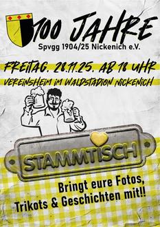 Am Freitag, 28.11.2025 ab 18:00 Uhr lädt die Spvgg 1904/25 Nickenich e. V. zum Jubiläums-Stammtisch ins Vereinsheim im Waldstadion ein.