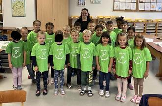 Zusammen mit den Klassenlehrern verteilten Mitglieder des Fördervereins die T-Shirts persönlich an einem Schulmorgen unter den Kindern. Den Kindern war die Freude anzusehen und die neuen Shirts wurden natürlich direkt anprobiert.
