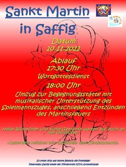 Am 10. November ist es wieder soweit! Nach dem Wortgottesdienst um 17:30 Uhr, begleitet die Feuerwehr Saffig den Umzug zur Begegnungsstätte mit musikalischer Unterstützung des Spielmannszuges. Nachdem das Martinsfeuer entzündet wurde, werden der Förderkreis KITA/Grundschule und die Feuerwehr für das leibliche Wohl sorgen.