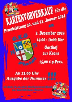 PLAIDT. Für alle Interessierten und Karnevalfans öffnet die GKG Plaidt e.V. am 02.12.2023 von 14.00 bis 16.00 Uhr die Tore des Gasthofs zur Krone in Plaidt und bietet die Prunksitzungskarten zum Vorverkaufspreis von 15 € pro Person an.