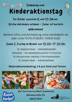 Der nächste Kinderaktionstag findet am 14.11.2025 von 15:00 - 17:30 Uhr statt. Um Anmeldung wird gebeten: Tel. 02632 6162 oder E-Mail: plaidt@ekir.de