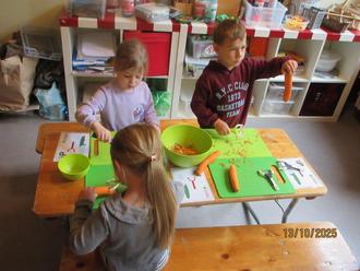 In der katholischen Kindertagesstätte „Mariengarten“ in Saffig, die unter der Trägerschaft der KiTa gGmbH Koblenz steht, hat am Montag, den 13.10.2025 eine wunderbare Aktion stattgefunden. Das Landesministerium für Klimaschutz, Umwelt, Energie und Mobilität bringt im Rahmen des Programmes „Rheinland-Pfalz isst besser“ Ernährungsbildung direkt zu den Zielgruppen vor Ort. Die Kinder in Saffig wurden von einem engagierten Team, welches mit einem „Kochbus“ anreiste, besucht. Den ganzen Vormittag hatten die Kinder die Möglichkeit, sich auf spielerische und spannende Art mit verschiedenen Lebensmitteln auseinanderzusetzen und deren Eigenschaften und Zubereitungsmöglichkeiten kennenzulernen. Aus gesunden Lebensmitteln, die zuvor in einem Karton ertastet werden konnten, wurde anschließend gemeinsam ein Zwei-Gänge-Menü gezaubert: Kartoffelpüree, Erbsen- und Möhrengemüse und Möhrenhaferbratlinge. Zum Nachtisch gab es ein Apfel-Birnencrumble mit Vanillesoße. Das „Kochbus“-Team erklärte den Kindern hierbei auch den sicheren Umgang mit Küchenmessern und Schälwerkzeugen. Es war ein lehrreicher und abwechslungsreicher Vormittag und das selbstgekochte Essen, welches zum Schluss gemeinsam gegessen wurde, hat den Kindern sehr gut geschmeckt.