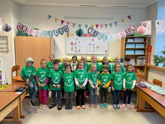 Zusammen mit den Klassenlehrern verteilten Mitglieder des Fördervereins die T-Shirts persönlich an einem Schulmorgen unter den Kindern. Den Kindern war die Freude anzusehen und die neuen Shirts wurden natürlich direkt anprobiert.