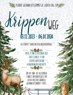 Der Rundweg durch den Park, der auch mit dem Kinderwagen befahrbar ist, startet an der Noldensmühle und bietet über 30 Stationen mit liebevoll gestalteten Krippen, die in der Dunkelheit sogar beleuchtet sind. Endpunkt ist auch dieses Jahr die Grillhütte, wo man sich am 03., 17., und am 23. Dezember 2023 von 13.00 – 17.00 Uhr bei leckeren Waffeln und Glühwein stärken kann.
