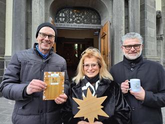 Sandra Rheindorf-Weber und Ehemann Wolfgang Weber (rechts) präsentieren zusammen mit Pfarrer Norbert Missong vor der Pfarrkirche Sankt Dionysius in Kruft eine der schönen Tassen, die bei den Adventsfenstern zum Kauf angeboten werden.