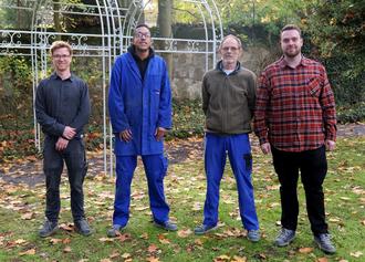Der neue Laubengang passt perfekt in die romantische Atmosphäre des Saffiger Schlossparks. Das Team der Schlosserei der St. Josefs-Werkstätten Plaidt ist sichtlich stolz auf die geleistete Arbeit (v.l.n.r.: Jens Gail, Jarvis Stachniß, Pascal Andres und Nicolas Conte).