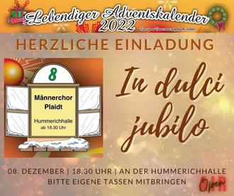 Am Donnerstag, dem 8. Dezember 2022 ist in diesem Jahr der Männerchor Plaidt an der Reihe: Vor der Hummerichhalle trägt der Männerchor einige selten gehörte Weihnachtslieder vor und unterhält zwischendurch mit weihnachtlichen Gedichten und Geschichten.