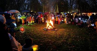 Die selbst gebastelten Laternen der Kinder erhellten die Wegstrecke und erfreuten alle Teilnehmer. An der Grillhütte angekommen, versammelten sich alle, um gemeinsam am Feuer Martinslieder zu singen.