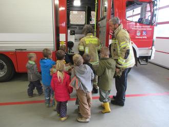 Es wurde auch die Arbeitskleidung gezeigt, die bei einem Einsatz getragen wird und die Kinder durften im Anschluss daran in einem der Feuerwehrfahrzeuge Platz nehmen.