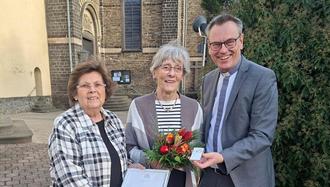 Chorvorsitzende Monika Leinz, Ehrenvorsitzende Karola Breitbach und Präses Pfarrer Norbert Missong vor der Sankt Arnulf Pfarrkriche.