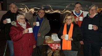 Walter Heimann, Monika Bermel, Jürgen Zinken, Pfarrer Norbert Missong, Sandra Rheindorf-Weber und Trudel Heimann beim Stand am Lichterabend.