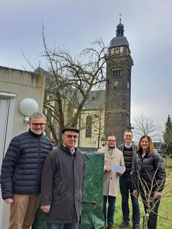 Foto: Nachhaltige Bewässerung zur Bewahrung der Schöpfung. (Von links nach rechts:) Pfarrgemeinderatsvorsitzender Wolfang Weber, stellvertretender Verwaltungsratsvorsitzender Hans-Walter Schneichel, Altpilgerführer Rainer Lenzgen, Pfarrer Norbert Missong und Jungpilgerführerin Esther Nittenwilm beim Regenwassertank.