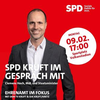 Die SPD Kruft lädt am Montag, 09.02.2026, um 17:00 Uhr zu einer öffentlichen Gesprächsveranstaltung mit dem SPD-Landtagsabgeordneten Clemens Hoch, Staatsminister ein. Die Veranstaltung findet auf dem Sportplatz Vulkanstadion in Kruft statt.