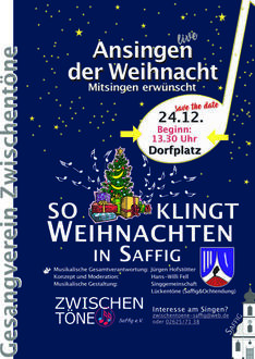 In diesem Jahr gibt es eine großartige Neuigkeit. Sängerinnen und Sänger aus den Orten Saffig und Ochtendung haben sich in diesem Jahr zusammengeschlossen. Die Herztöne aus Ochtendung und die Zwischentöne aus Saffig bilden nun unter Leitung von Chorleiter Jürgen Hofstötter den neuen Chor „Lückentöne“. Die dreißig Aktiven haben viel geprobt und möchten für die Besucher einige Weihnachtslieder vortragen.