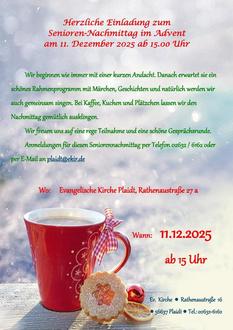 Nächster Seniorennachmittag am 11.12.2025 um 15:00 Uhr. Bitte melden Sie sich rechtzeitig an Tel. 02632 6162 oder E-Mail: plaidt@ekir.de