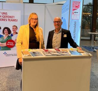 Die Barmherzigen Brüder Saffig präsentierten sich beim diesjährigen Pflegetag zusammen mit den weiteren BBT-Einrichtungen in Rheinland-Pfalz (v.l.n.r.: Maike Engel, Pflegedienstleiterin der Saffiger Fachklinik für Psychiatrie und Psychotherapie; Jörg Mogendorf, Pflegedirektor am Krankenhaus der Barmherzigen Brüder Trier).
