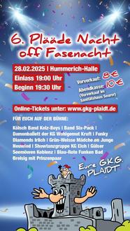 Nach den Megaerfolgen der letzten Jahre dürfen sich die Karnevalsparty-Fans auf die 6. Plääde Nacht off Fasenacht am 28.02.2025 in Plaidt freuen. Der Kartenvorverkauf hat bereits begonnen. Es werden Stehplätze mit freier Plazwahl angeboten.