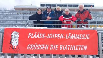Klein, sehr klein war die Truppe der Plääde-Loipen-Lämmesje, die im Januar den Weltcup der besten Biathleten/innen in Ruhpoldung besuchten. Bei herrlichem Winterwetter, bei der Anreise hatte es kräftig geschneit, konnten die ganze Woche die spannenden Wettkämpfe verfolgt werden. Selbstverständlich wurde unser Vereinsbanner publikumswirksam auf der Haupttribüne befestigt.