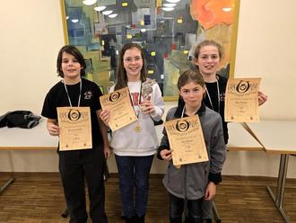 Lennard Spiller, Nathalie Stein sowie Max und Tim Wohde von den Nickenicher Schachfreunden konnten bei den Einzelmeisterschaften der Schachjugend Rheinland punkten. Nathalie Stein (2. v. links) ist sogar zweimalige Rheinlandmeisterin geworden.