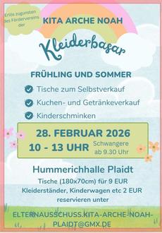In diesem Jahr findet der Frühlings- und Sommer-Kleiderbasar am 28.02.2026, von 10:00 Uhr bis 13:00 Uhr, in der Hummerichhalle in Plaidt statt. Schwangere dürfen bereits ab 09:30 Uhr stöbern. Tische können unter elternausschuss.kita-arche-noah-plaidt@gmx.de reserviert werden. Für das leibliche Wohl ist ebenfalls gesorgt. Die Kleinen können sich auf das Kinderschminken freuen.