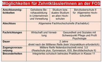 Für ZehntklässlerInnen ist dies über die FOS am schnellsten und auf direktem Wege erreichbar. Es können sich alle SchülerInnen mit dem Halbjahreszeugnis, welches zur Mittleren Reife führt, um einen Schulplatz bewerben.