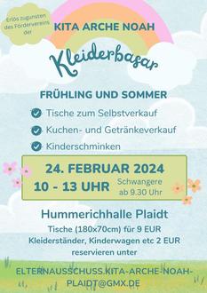 In diesem Jahr findet der Frühling- und Sommer-Kleiderbasar am 24. Februar 2024, von 10 Uhr bis 13 Uhr, in der Hummerichhalle in Plaidt statt. Schwangere dürfen bereits ab 09:30 Uhr stöbern. Für das leibliche Wohl ist ebenfalls gesorgt. Die Kleinen können sich auf das Kinderschminken freuen.