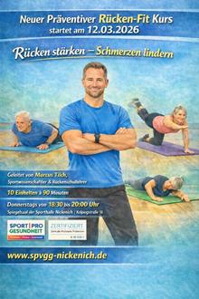 Rückenschmerzen, Verspannungen, Ziehen im Nacken - viele kennen das nur zu gut. Doch das muss nicht so bleiben! Die Sportvereinigung Nickenich startet ab 12.03.2026 den neuen Kurs „Rücken-Fit“, der gezielt hilft, Beschwerden vorzubeugen und zu lindern.