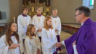 In der der Sankt Arnulf Pfarrkirche wird Kiara Wohlleben verabschiedet von (obere Reihe) Adrian Neumann, Lara Ducht und Felix Meister sowie von Lotte Spiller, Anni Boos und Pastor Norbert Missong.