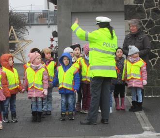 Spannender Besuch: Bei den älteren Kinder der Katholischen Kita St. Elisabeth Kruft schaute eine Polizistin der Polizeiinspektion Andernach vorbei. In der Turnhalle hatten die „Großen“ die Möglichkeit mehr über die Polizei zu erfahren und wie man eine Straße am besten überquert.