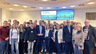 Oberbürgermeister Christian Greiner (5. v. l.), Bürgermeister Claus Peitz (4. v. r.) und Carina Lang, Sachbearbeiterin im Sportamt (5. v. r.), gemeinsam mit Andernachs Athletinnen und Athleten bei der Sportlerehrung 2024 im Historischen Rathaus.