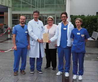 Freuen sich über den ersten Platz beim Förderpreis „Helfende Hand“: Dr. Lars Reinhold, leitender Oberarzt Anästhesie und Intensivmedizin, Dr. Ralph Rüdelstein, Chefarzt Innere Medizin, Geschäftsführerin Cornelia Kaltenborn, Arzt Andreas Solheid, Dr. Stephanie Al Dahouk-von Oertzen, Oberärztin Zentrale Notaufnahme.
